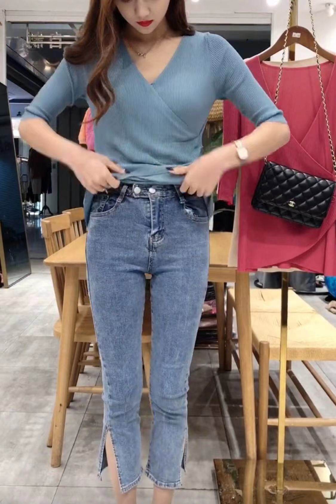 2021年新品女士设计感高腰蓝色牛仔裤修身显瘦力水洗开叉微喇裤热门设计联盟服务商