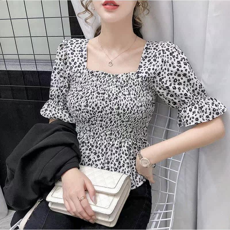 短袖气质锁骨2021设计感新款宽松方领t恤女收腰夏遮肚子上衣热门设计联盟服务商