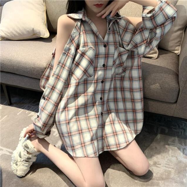 格子衬衫女2020春秋新款中长款韩版百搭宽松港味设计性感露肩上衣热门设计联盟服务商