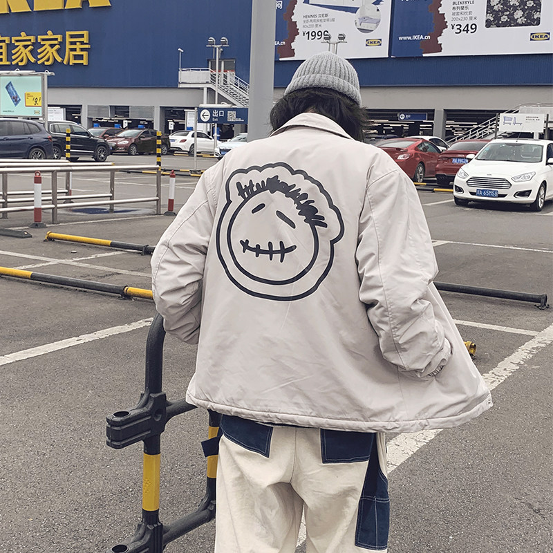 WOLA春秋笑脸工装教练夹克日系复古男女情侣款羊羔绒加厚外套国潮热门设计联盟服务商