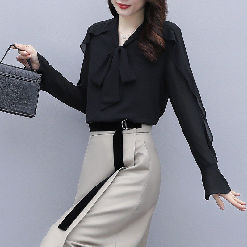 黑色雪纺衫女长袖春夏款打底衫气质V领小衫女人味设计感上衣小众热门设计联盟服务商